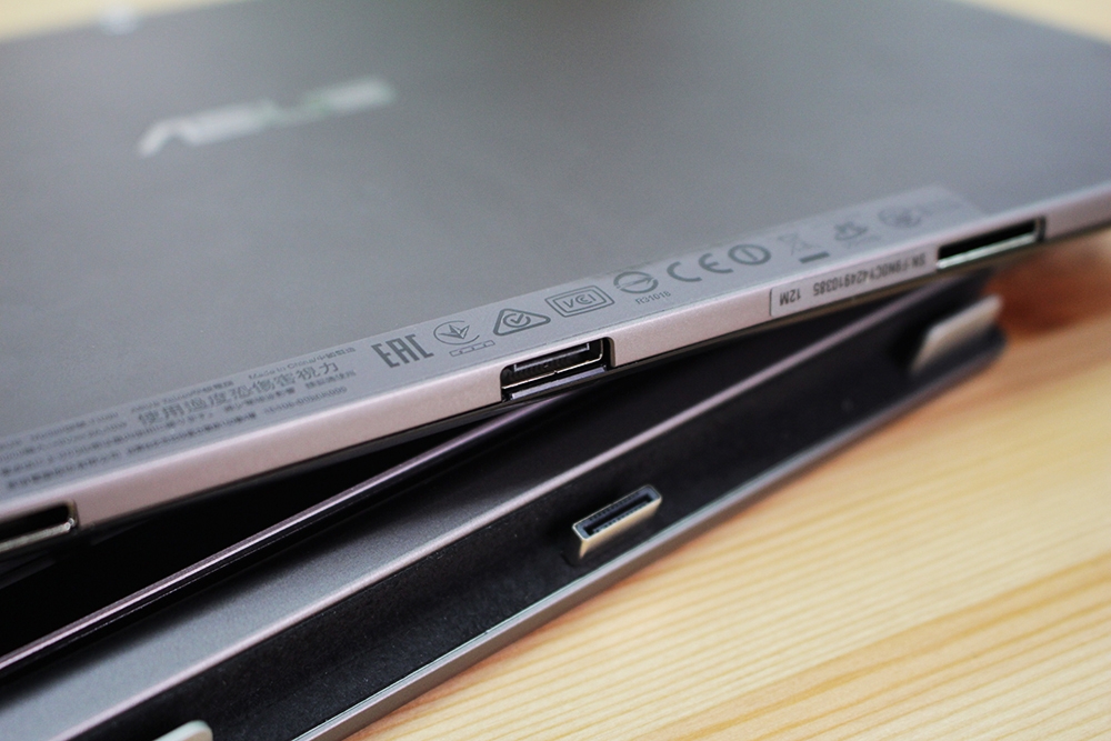 T100HA 底部有三個孔洞,這是為了與鍵盤配件連接而設計的,左右兩側是帶有磁力的固定釦,中間則是鍵盤與平板之間連線的接頭位置。