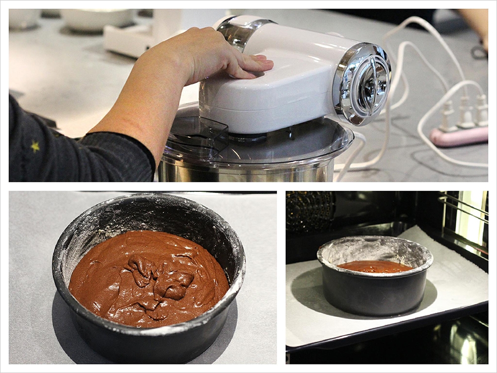 接著再加上中筋麵粉、可可粉、泡打粉、蘇打粉、鹽,做均勻的攪拌,最後把完成的材料倒入烤模,內壁要記得塗上奶油和灑上麵粉唷!「萬用廚師機」打出來的效果真的是綿密又細緻,做出來的蛋糕一定很好吃!