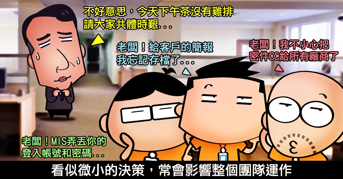 與其一直討論說要怎麼去管理員工或做好一個 Leader,想辦法提昇夥伴們的效率,不如好好先站在他們的角度去想想他們怎麼做事的,一整天的工作安排如果換你做的話,你會有什麼想法,或許這就是「微行動」可以去切入的地方。 微小的決策,其實很有機會激發「團隊力」或「團對立」,人與人之間的互動隊工作的影響真的很奇妙!