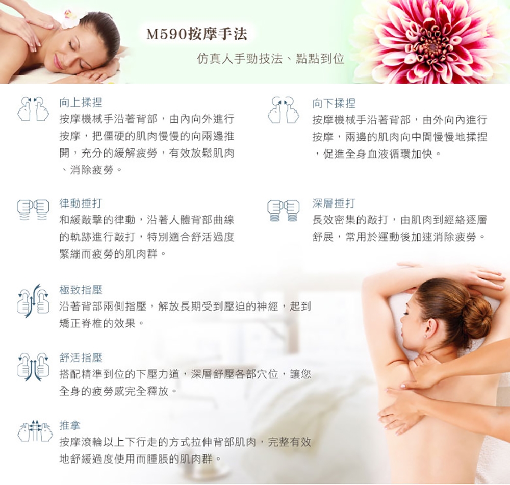BH M590 有新一代的自動控制程式和最新的人工智慧研發技術,其中更針對人體腰部曲線的特點,透過凸出達 10 公分的按摩球,讓按摩軌跡完全依據你的腰部曲線遊走,深層地深入各個穴位,技巧超棒的,清楚介面的手控器,內建 6 組按摩程序,按一下直接進入舒服的自動按摩程序,一切讓專業的來吧!