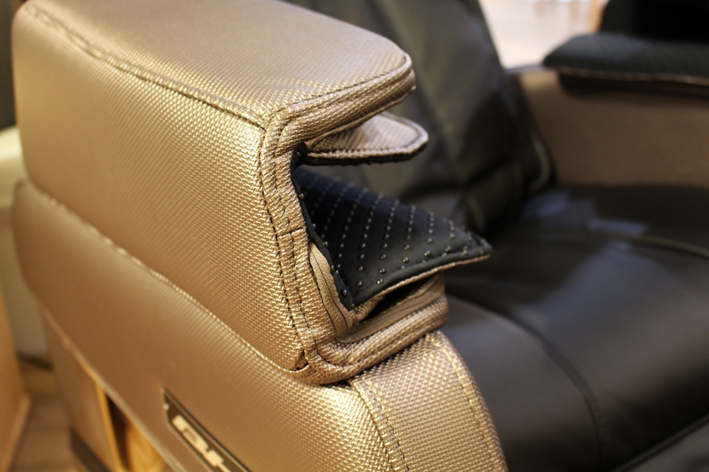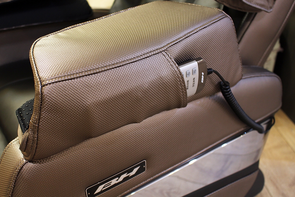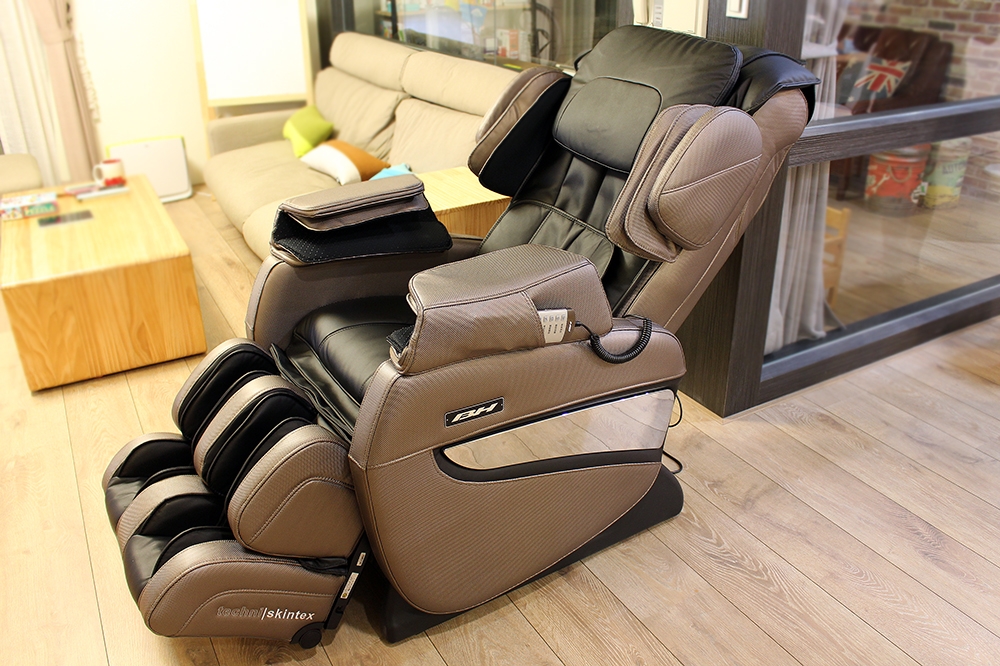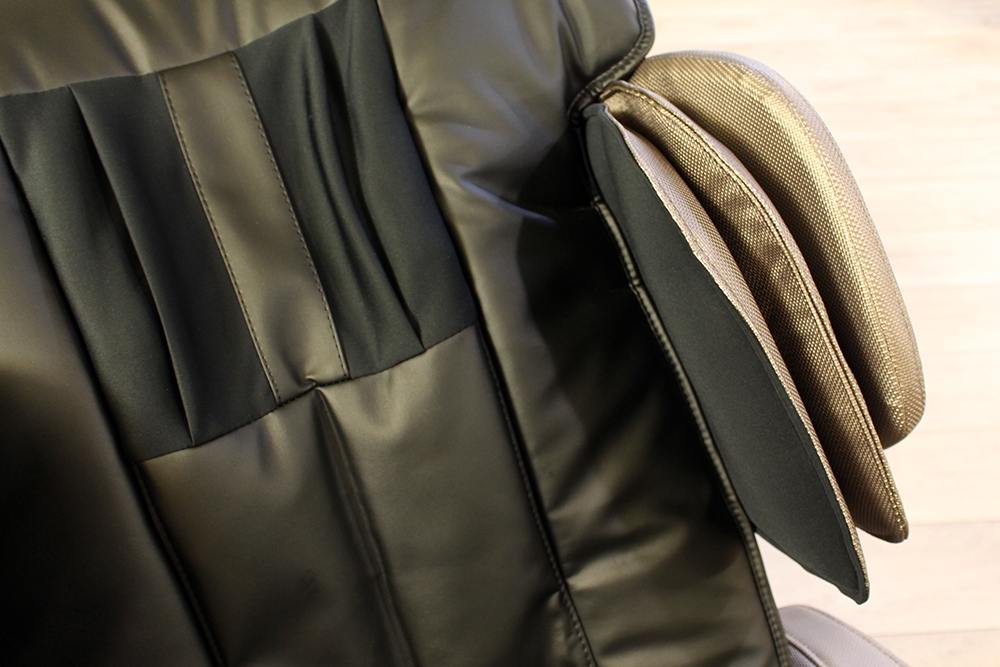 仔細看一下設計,無論細部質感或按摩部位的包覆,我覺得都設計得很棒,椅座的部份側邊有漂亮的鏡面飾片,搭配金屬色皮革和沉穩的黑色椅套,整個超有質感的啦!因為畢竟這是會一直跟自己身體接觸的產品,我覺得內部有扶貼覆感十足的椅墊和按摩區域,仔細到連車縫線都很溫和,真的是裡外兼具。